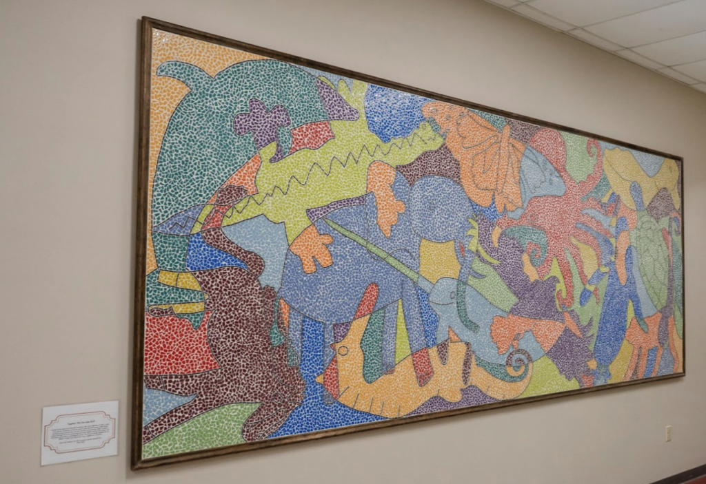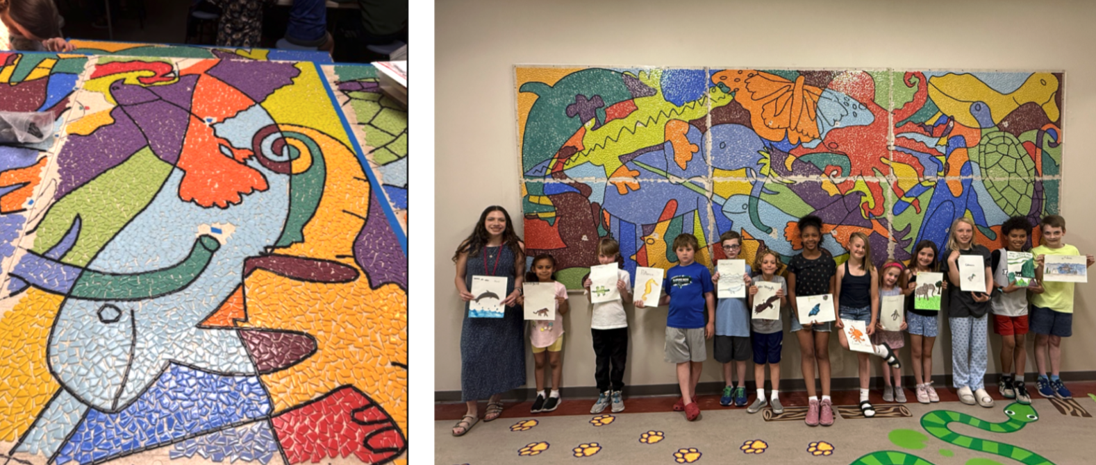 Every student chose an animal representing a personal character trait, designed it in art class, and watched as their shapes were layered into a Cubist-style mosaic. The finished 22’ x 11’ tile mural honors the school’s past while looking to the future, reflecting goals to showcase Lake Bluff’s values, involve all students in meaningful collaboration, connect to the school’s history and early art styles, and become a new piece of Lake Bluff history!